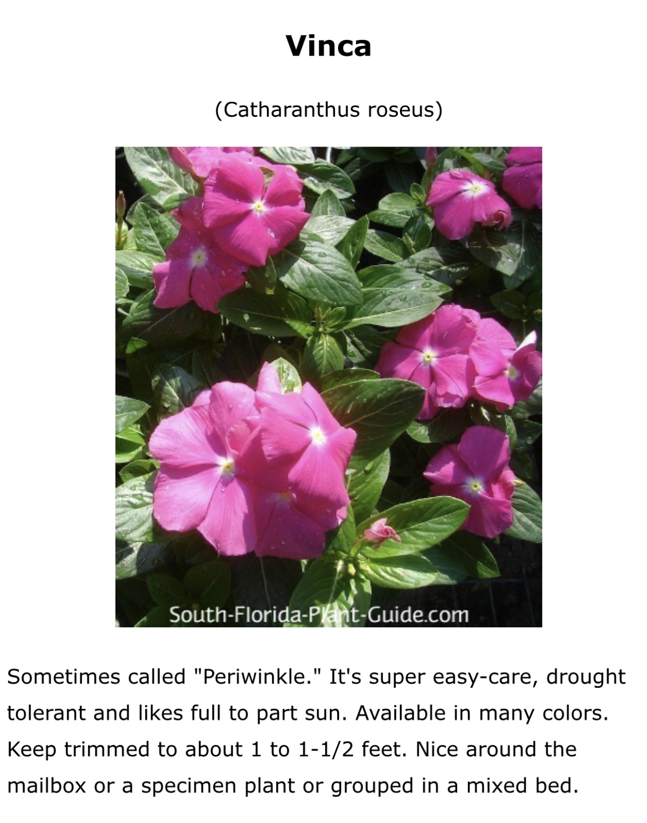 | Christmas Tree Palm | Pygmy Date | Vincas (many color choices) | |